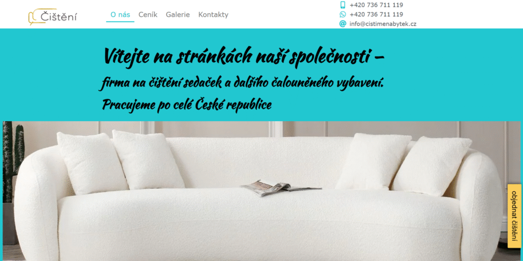 Разработка сайта для услуги по чистке мебели и бытовых вещей. Заказ простого сайта из 3 страниц в белом, голубом и золотом цветах.